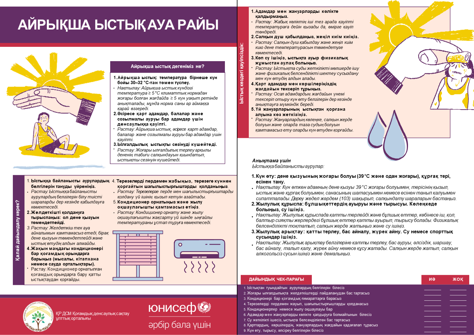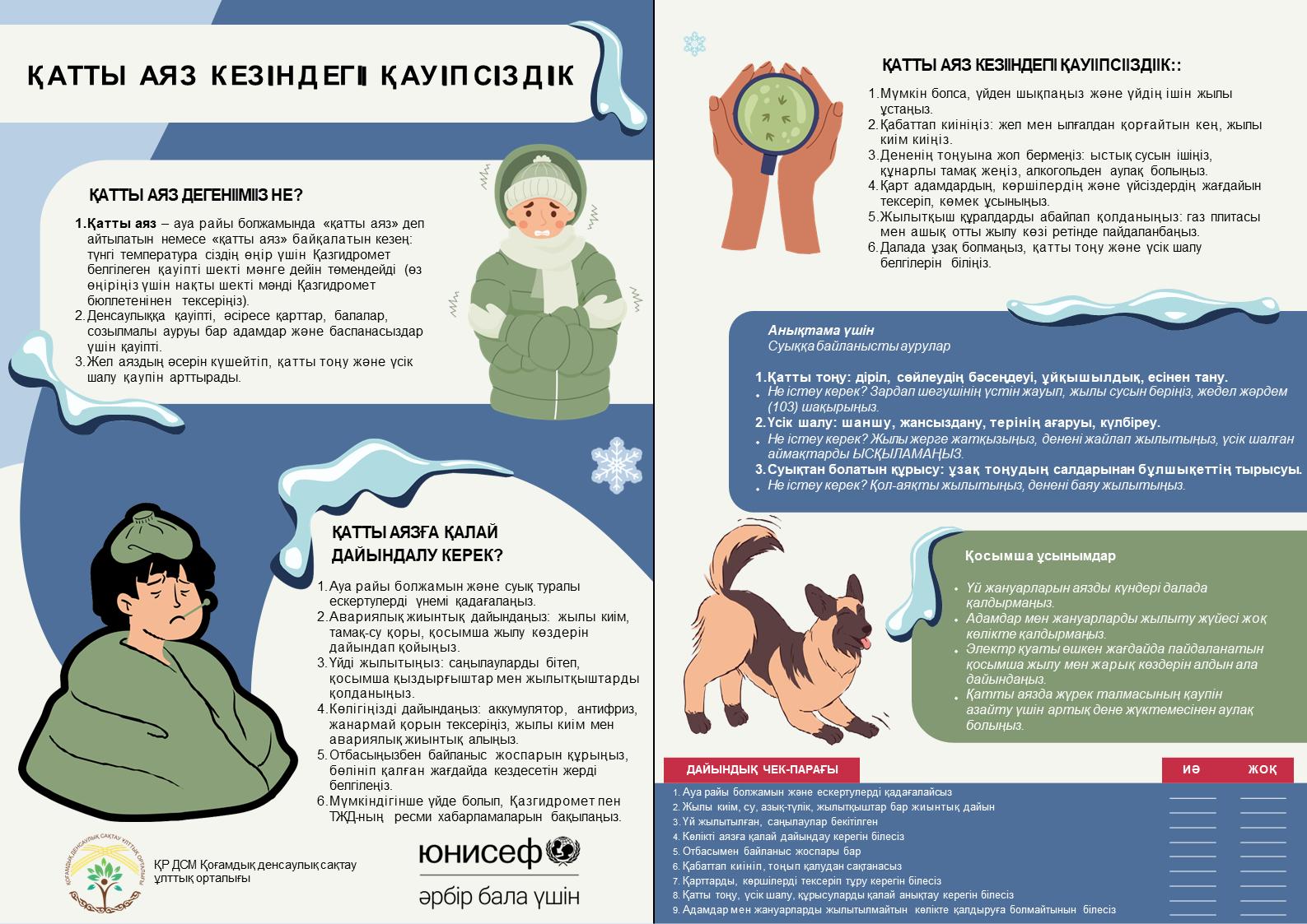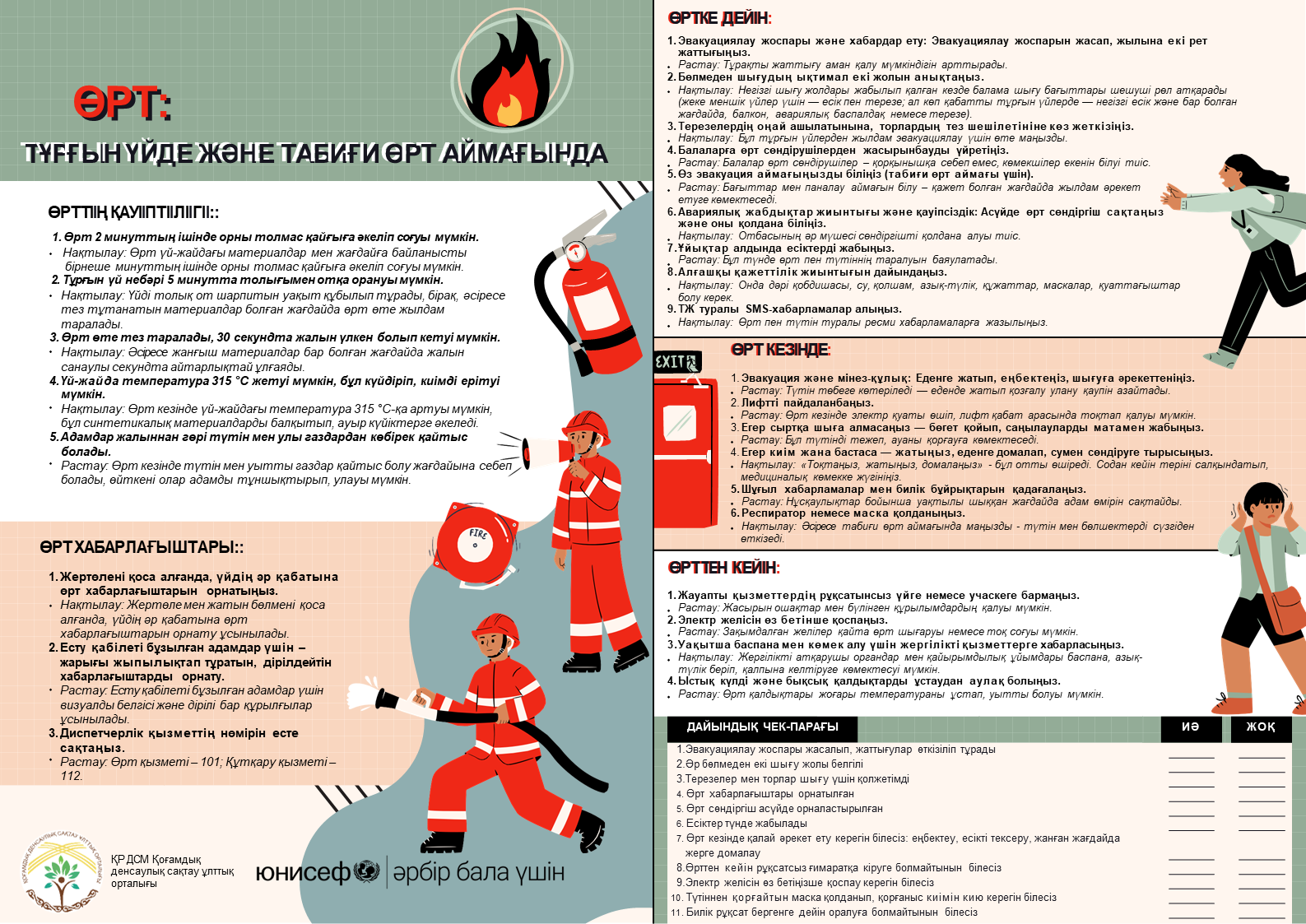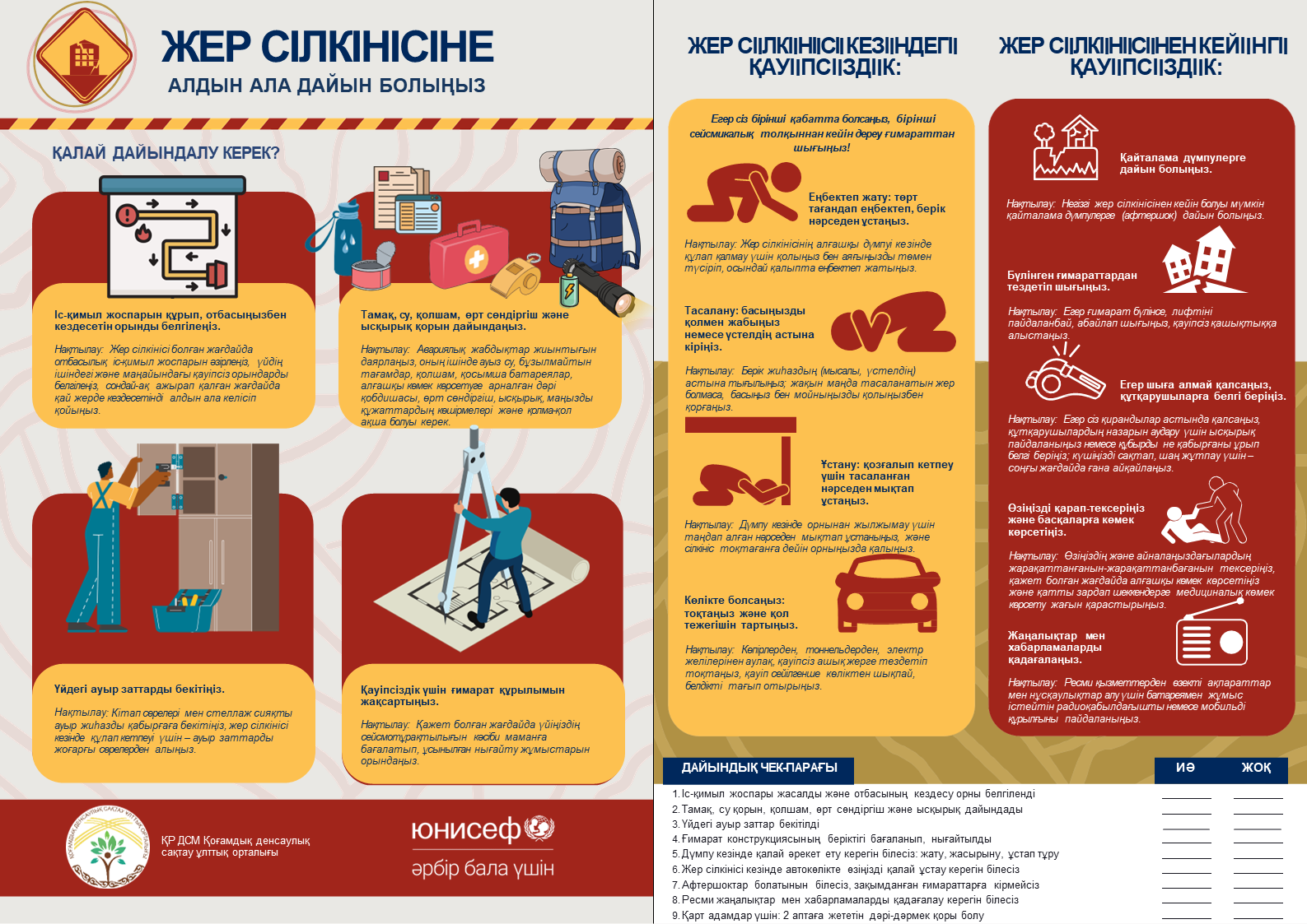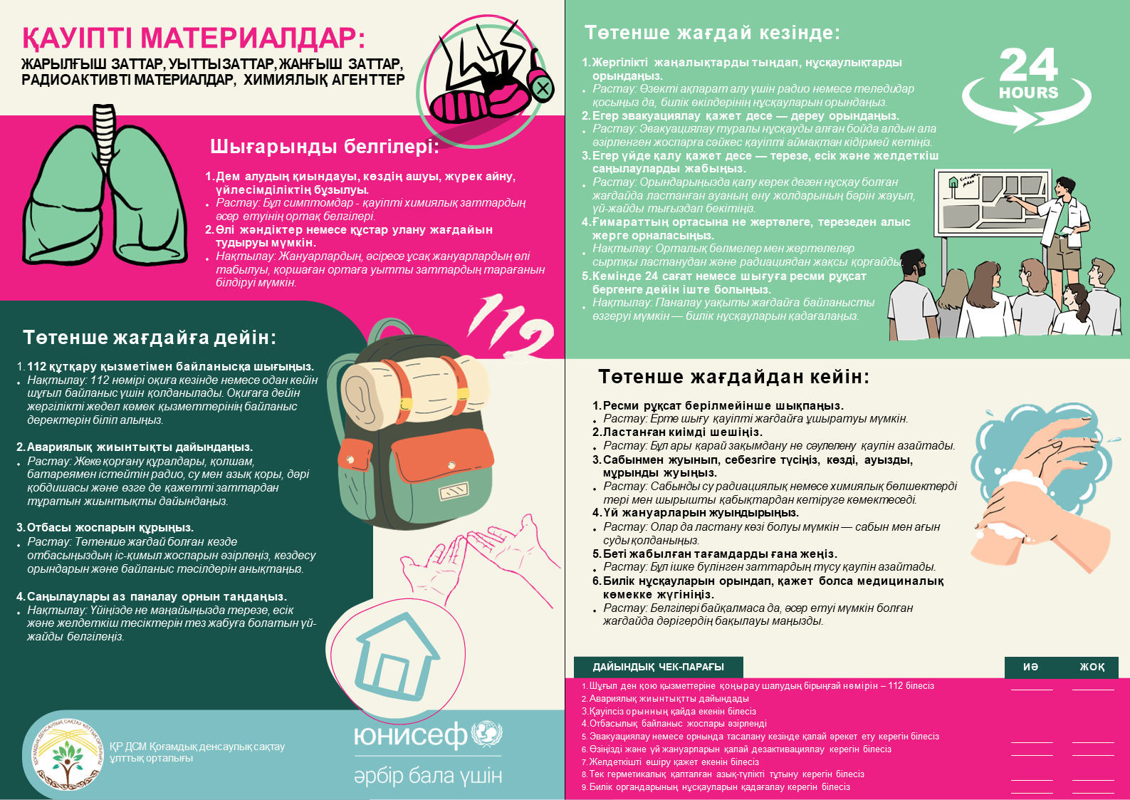 Халықты жер сілкіністеріне даярлау (төтенше жағдайға дейін, кезінде және кейінгі әрекеттер); өрт кезінде әрекет ету (тұрғын секторда және табиғи ортада); қауіпті заттармен (химиялық, радиациялық, жарылғыш және басқа) байланысты апаттар кезіндегі қауіпсіздік; экстремалды ыстықта денсаулықты қорғау және алдын алу шаралары; қатты аязда денсаулықты қорғау және алдын алу шаралары; халықтың су тасқыны және сел кезіндегі әрекеттері.